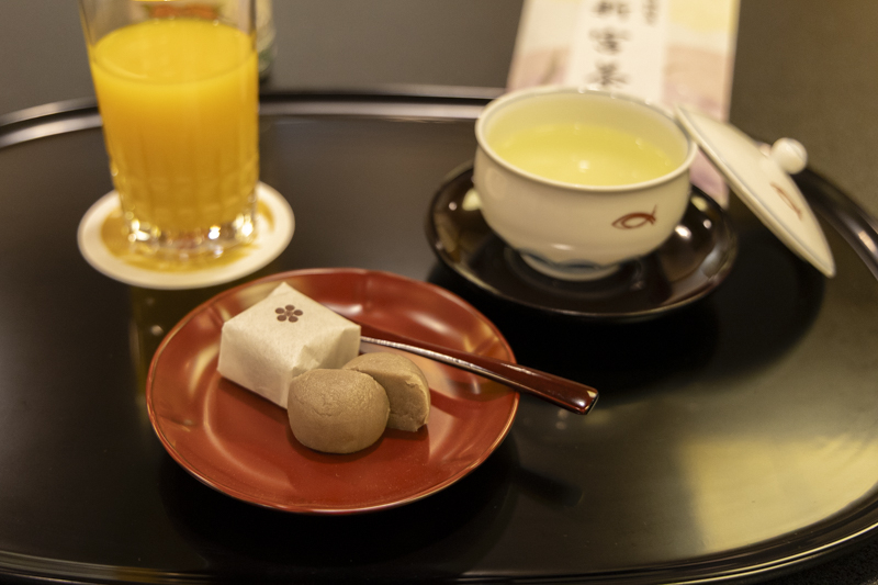 | 午後のおやつ | ■冷たい狭山和紅茶 ■国産オレンジジュース | ■百合根金団(きんとん) ■いちご大福、温かい金の抹茶 ■国産オレンジジュース ■温かいハンドドリップコーヒー |