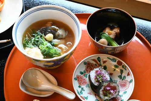 ■名物ぽんきし膳―きしめんすっぽんスープ仕立て―(「近大マグロの太巻き」「もち豚の柔らか角煮」「水菓子(フルーツ盛り合わせ、わらび餅)」付き)